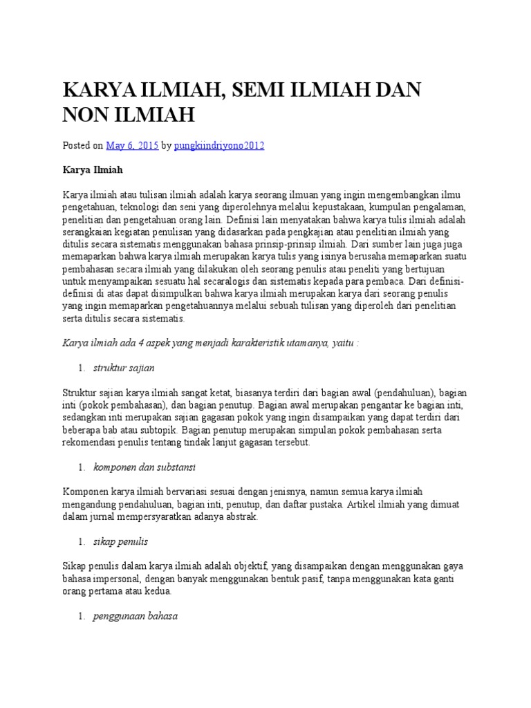 Contoh Karya Ilmiah Semi Formal Pdf Modif 9 from lh5.googleusercontent.com Untuk membuat karya tulis yang logih, baku, ilmuah, valid dan memenuhi kaidah penulisan karya tulis ilmiah, terdapat struktur yang menjadi poin penting di dalamnya, bagian ini sendiri di antaranya adalah sebagai berikut ini, lengkap dengan penjelasan lengkapnya. Karya ilmiah biasanya diuraikan dalam bentuk laporan tertulis yang isinya memaparkan hasil penelitian atau pengkajian yang telah dilakukan oleh seseorang atau sebuah tim sesuai ketentuan yang berlaku. Adalah sebuah penulisan yang menyajikan fakta dan fiksi dalam satu tulisan dan penulisannyapun dengan bahasa konkret, gaya bahasa formal, dan didukung dengan fakta umum yang dapat dibuktikan benar atau tidaknya atau sebuah penulisan yang menyajikan fakta dan fiksi dalam suatu tulisan dan penulisannya tidak semiformal. Karya ilmiah disusun berdasarkan struktur atau kaidah tertentu. Contoh karya ilmiah semi formal. Unsur dalam penulisan karya ilmiah formal. Struktur karya ilmiah formal, seperti skripsi, tesis, atau disertasi biasanya menggunakan struktur dan metode tertenu sesuai ketentuan lembaga yang menaunginya. Tujuan penulis menyusun karya tulis ilmiah ini salah satunya adalah sebagai persyaratan mengikuti un dan uas tahun ajaran 2014 2015.